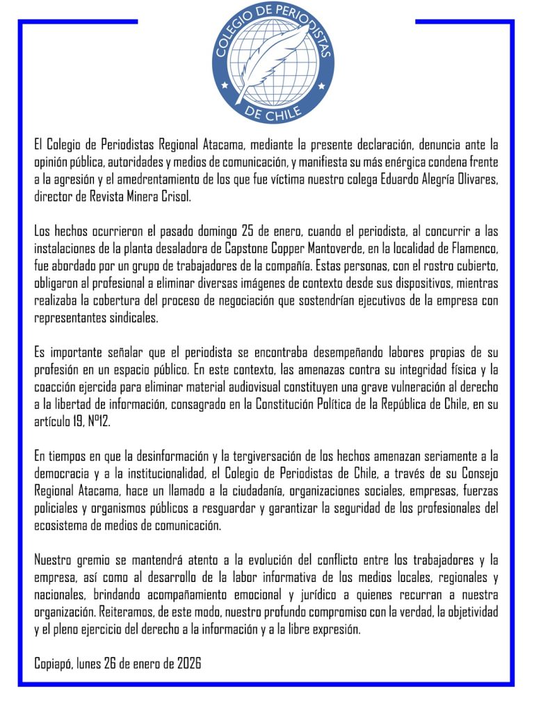 Frente al atentado contra la libertad de trabajo y de expresión que sufriera nuestro Director, periodista Eduardo Alegría Olivares, por parte de huelguistas encapuchados del Sindicato Nº 2 de Mantoverde, el Colegio Regional de Periodistas de Atacama, condenó los hechos de agresión y amedrentamiento de la que fue objeto el profesional de las comunicaciones mientras se encontraba trabajando en la vía pública frente a la Planta Desalinizadora, la cual se encuentra tomada desde el domingo 18 de Enero.