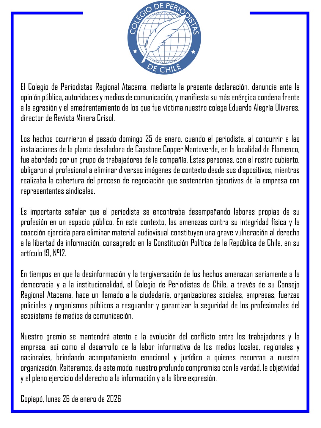 Frente al atentado contra la libertad de trabajo y de expresión que sufriera nuestro Director, periodista Eduardo Alegría Olivares, por parte de huelguistas encapuchados del Sindicato Nº 2 de Mantoverde, el Colegio Regional de Periodistas de Atacama, condenó los hechos de agresión y amedrentamiento de la que fue objeto el profesional de las comunicaciones mientras se encontraba trabajando en la vía pública frente a la Planta Desalinizadora, la cual se encuentra tomada desde el domingo 18 de Enero.