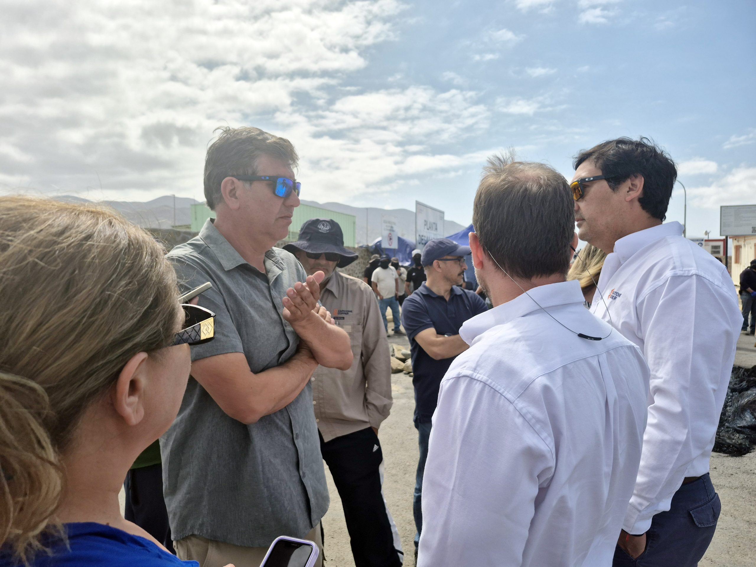El Gerente de Planta Sulfuros Mantoverde, Nilson Saldía, en los instante en que dialoga con el abogado de los huelguistas, Marcos López y dirigentes sindicales.