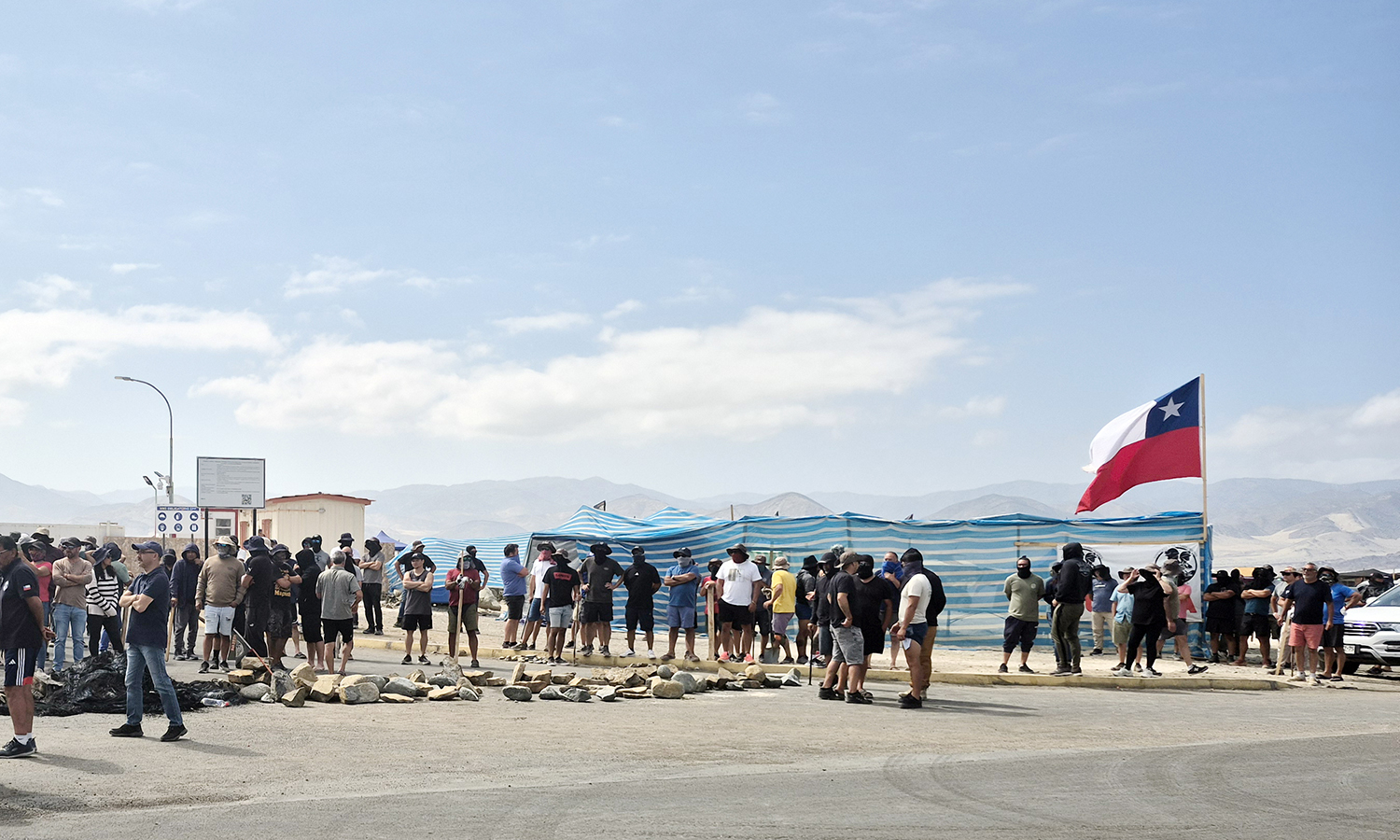 La planta Desaladora ubicada en la costa del Balneario de Flamenco. Sector Villa Alegre, continua tomada por los huelguistas, quienes levantaron improvisados puntos de vigilancia en caso de querer ser desalojados; mientras que en el ingreso principal a la Planta Desaladora y, donde se mantiene la mayoría de ellos encapuchados, levantaron trincheras de piedras para evitar el ingreso de vehículos.